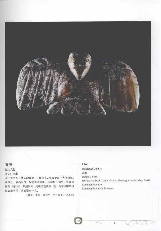 無耳為鷹,是太陽的象征,凸眼,折肩,雙爪在腹部,背部有兩個隧孔,典型紅山文化特征。