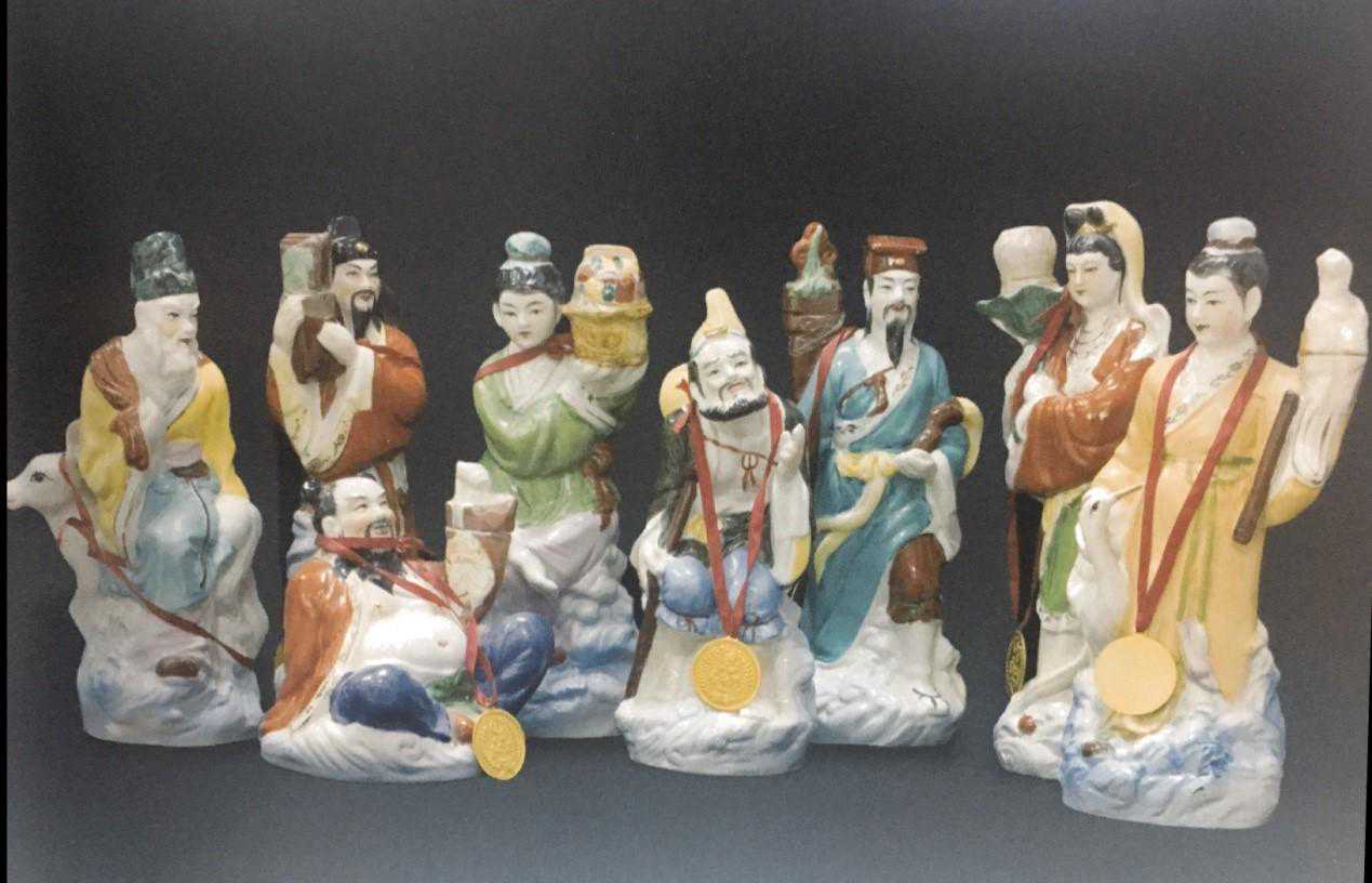 广为流传的“八仙过海”传说,最早见于杂剧《争玉板八仙过海》中,八仙分别为汉钟离、张果老、韩湘子、铁拐李、吕洞宾、何仙姑、蓝采和及曹国舅。相传白云仙长有回于蓬莱仙岛牡丹盛开时,邀请八仙及五圣共襄盛举,回程时铁拐李建议不搭船而各自想办法。而这套“八仙过海”酒瓶活灵活现地体现了“八仙过海,各显神通”的动作与神态。
