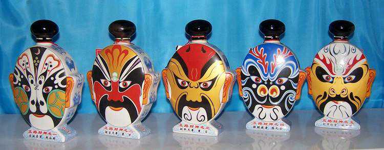 脸谱是中国戏曲演员脸上的绘画,用于舞台演出的化妆造型艺术,也被用于酒瓶设计。五路神酒瓶由河南商丘五路神酒业公司出品,瓶上分别绘有《封神演义》中的赵公元帅、招宝天尊萧升、纳珍天尊曹宝、招财使者陈九公和利市仙官姚少司五路神的京剧脸谱。