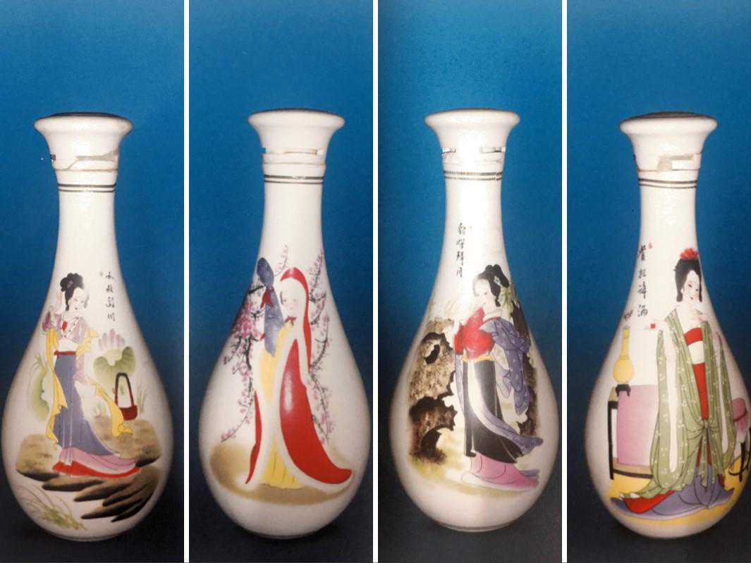 2007年在潘家园举办的首届酒器收藏展中,孙昭达收藏的一套鼓腔瓶体现了古代四大美女的传奇故事,四个酒瓶分别描绘了西施浣纱、昭君出塞、貂蝉拜月与贵妃醉酒的画面。