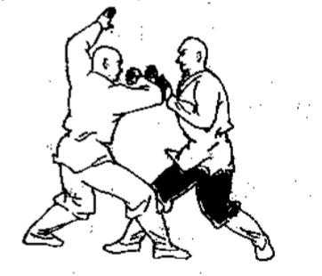 紧接上动,乙速向后退身撤步。同时,右臂翻滚,五指紧靠并拢,指尖用力向前下方点戳甲胸下中庭穴。甲两臂内旋,力达拳面,猛然向前上方摆击贯打乙两耳听宫穴(图)