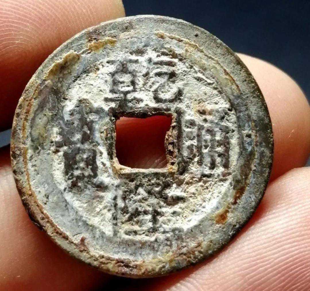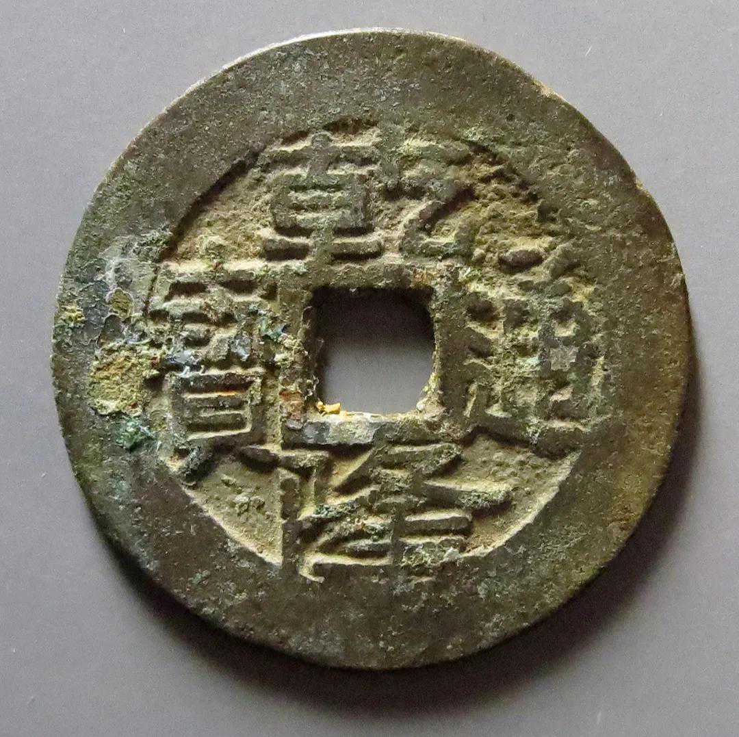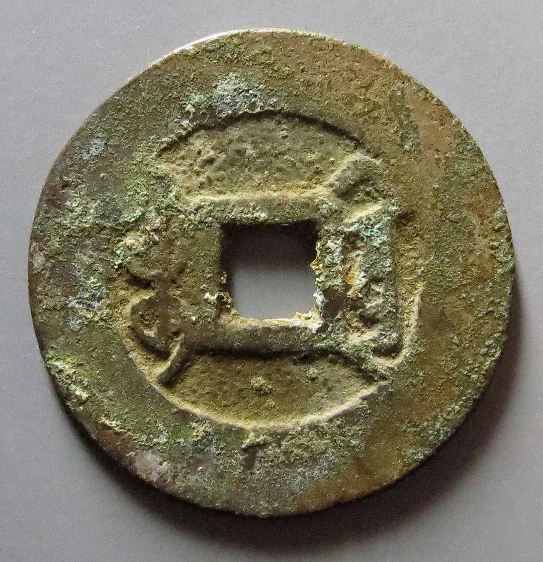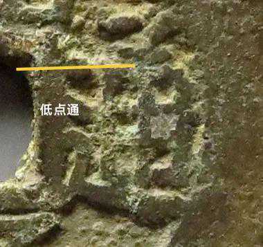 大家先看一下这个钱的通字,这个钱的通字写得非常有个性,两个点写的位置非常低,比通方头的地方还要低,这个是这个钱币的特点之一。