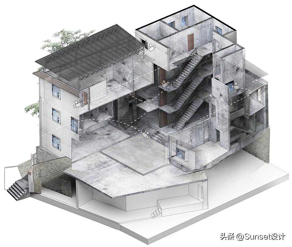 Theinternalspatialorderoftheoriginalbuildingbeginswithasavagegrowthfromthebottomup,whichpresentsachaoticanddramaticnarrativewithinalimitedscale:thefirstfloorislessthan200squaremeters,andtherearethreestairswithdifferentpositionsandshapes;theinteriorisfullofunexpectedheightdifferencesanddooropeningsthatleadtonowhere;outdoormaterialssuchaswashedstoneandveneerbrickssuddenlyappearindoors,,withanindepentandself-consistentnarrativestructure.