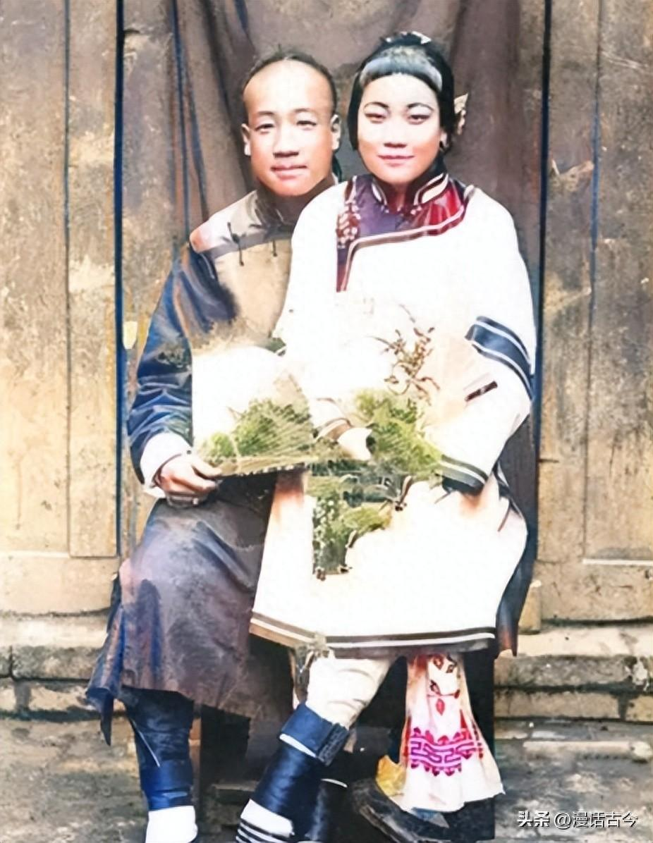 照片中,男子手持一把精致的折扇,风度翩翩。他身着华贵服饰,细节之处尽显品味,家境显然殷实。女子妆容精致,面若桃花,甜美可人。她那双小巧玲珑的脚,尤为引人注目,似乎被精心裹于绣花鞋中。两人相拥而坐,亲密无间,洋溢着甜蜜与幸福,仿佛在诉说着一段美好的爱情故事。