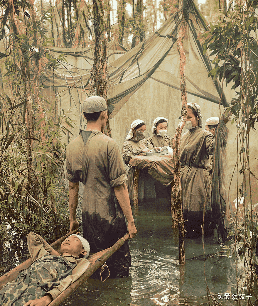 越战时美国轰炸的受害者,为了躲避轰炸,北越军队不得不躲到丛林里救治伤员。