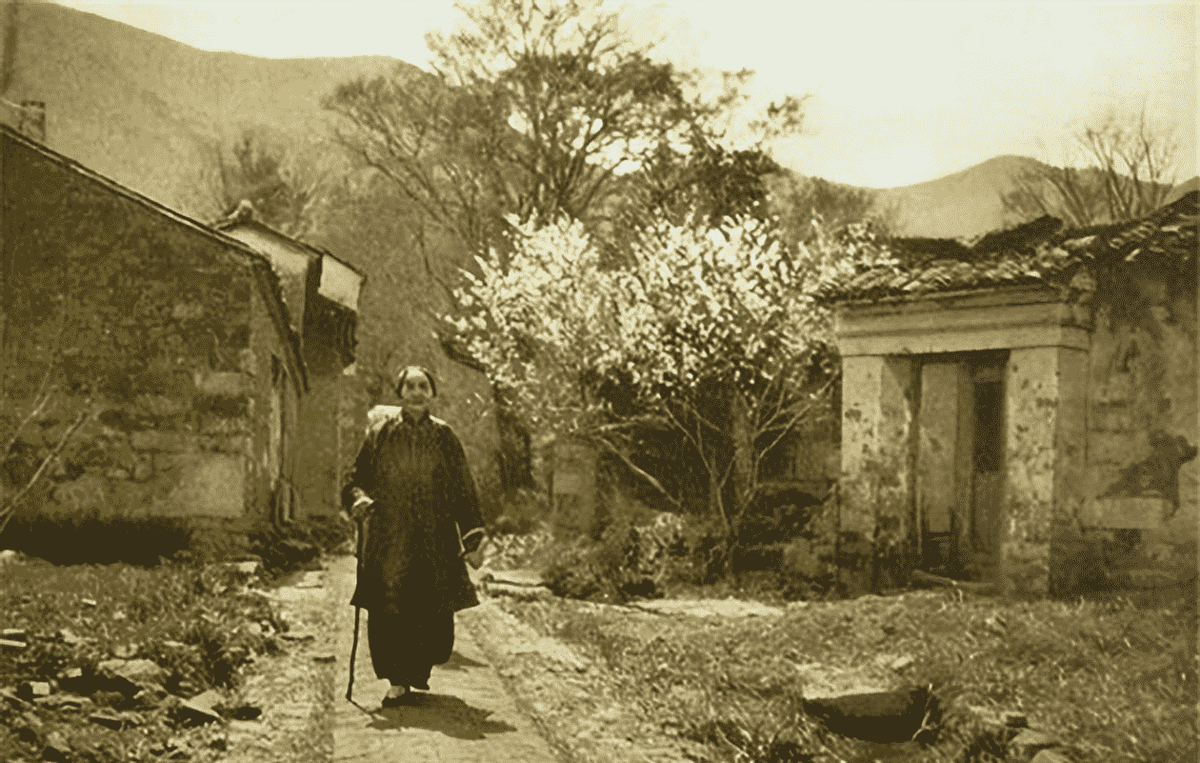 晚清时期站在桃花树前神采奕奕的老太太照片。