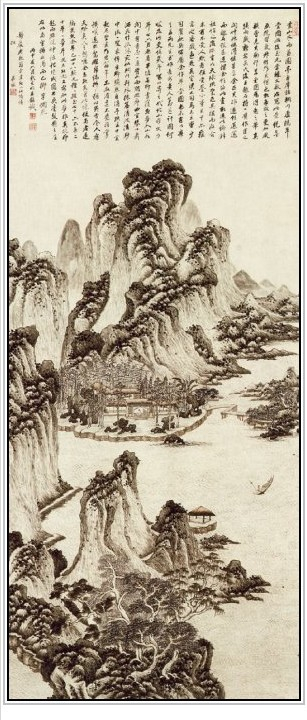 这件作品即描绘了一个夏日山居的情景。画面上一座高山大岭在深谷间蒸腾的云气中挺拔而起,其四周群峰列护。虚实变化,主次有序,气脉贯通。两岸林木葱郁,水阁回廊,茅屋庭院,小路逶迤。数位隐士,在屋中,在院落,或坐或立,闲聊纳凉,好一种清静闲适的山居生活。这件作品亦是画家仿梅道人山水而作,其笔法秀密,墨色清淡,虽少梅道人之迹,然其闲逸之趣,却直追古人。