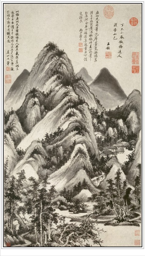 王鉴此图画层层山峦簇拥主峰,苍翠丛林之中,村舍水阁错落,山石用长披麻皴,深得巨然之韵。