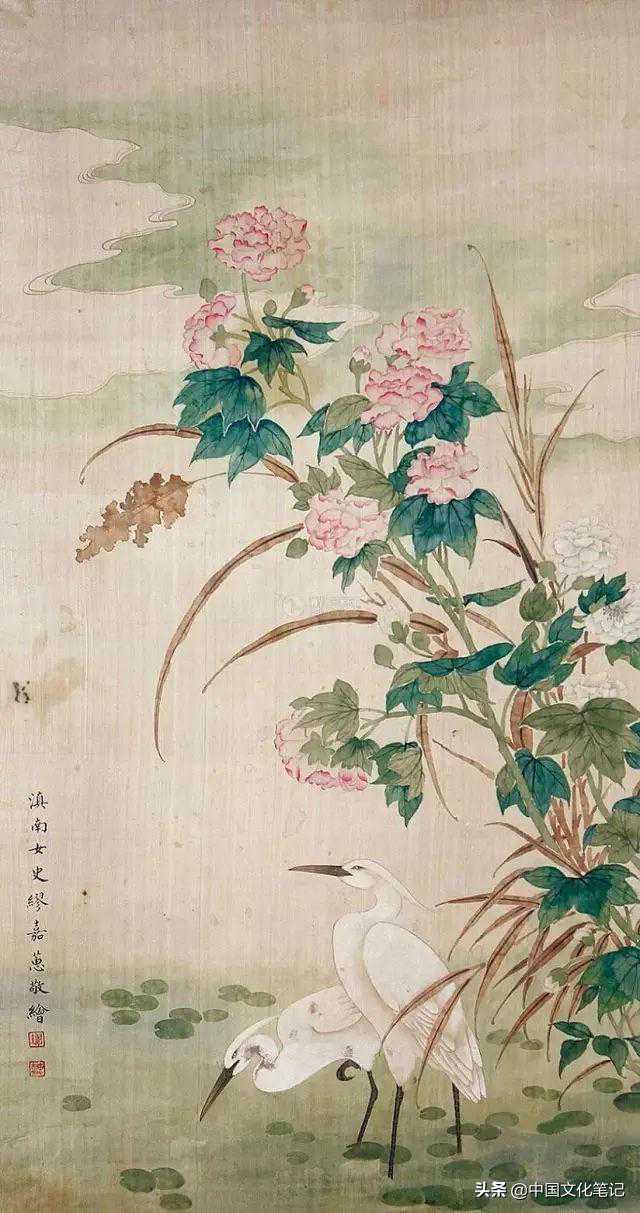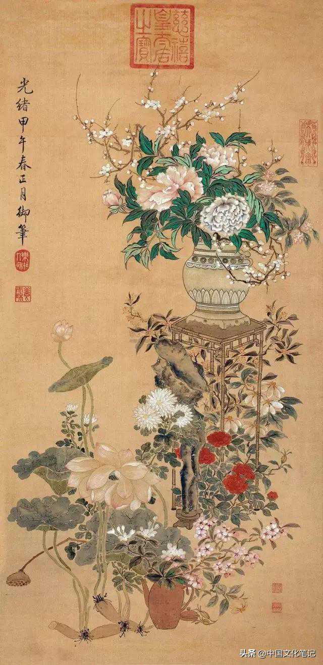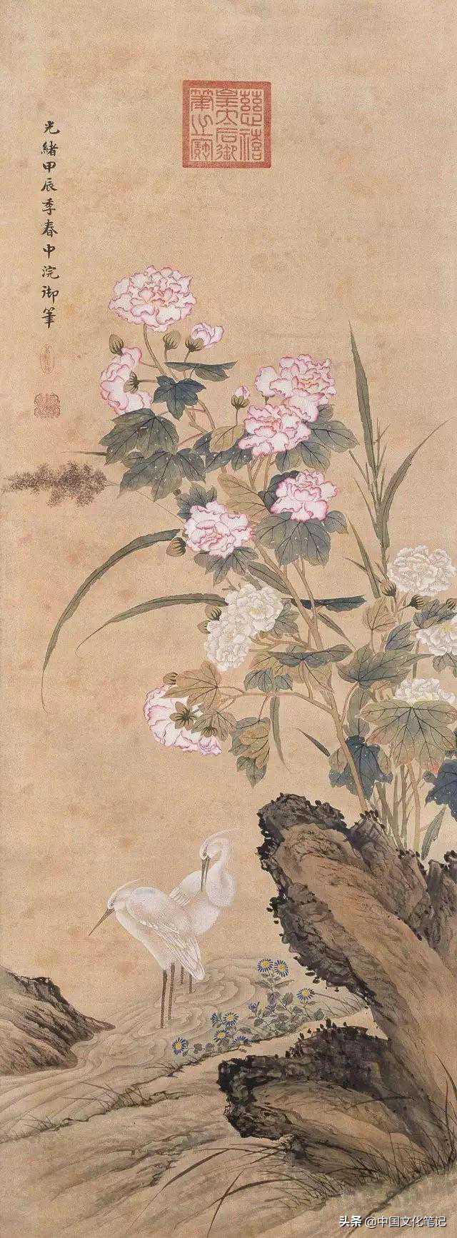 就我以为,那些盖有慈禧大印的书画作品,大部分是按照“慈禧指示、缪素筠创作”的方法绘制出来的。晚清的夏仁虎曾说,“内廷如意馆画工皆是苏州人,光绪间昆明缪素筠女史嘉惠工花卉,承旨二十余年。每当拈毫染翰,孝钦皇后并坐指示之,眷遇始终不衰。”所以慈禧太后只是“并坐指示之”,待画好之后,钤上自己的印章即可。
