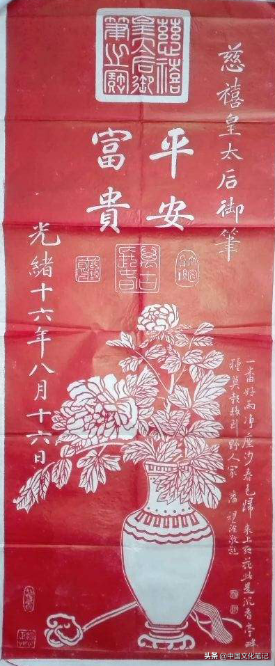 慈禧“御笔”的绘画作品传世不少,据说在慈禧身为皇太后的1888年至1908年间,留传下来的作品就达到近七百件,仅北京故宫博物院旧藏的慈禧款《牡丹图》就不下百件(见李湜:《慈禧的书画及代笔人》)。因此各博物馆的清代书画展尤其是皇室书画展中,经常能看到慈禧的画作,甚至还出现了慈禧《平安富贵图》的碑刻拓片。