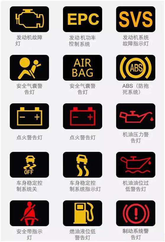 当出现如下类型故障灯时,建议停车检修(查),以避免出现更严重的危害。