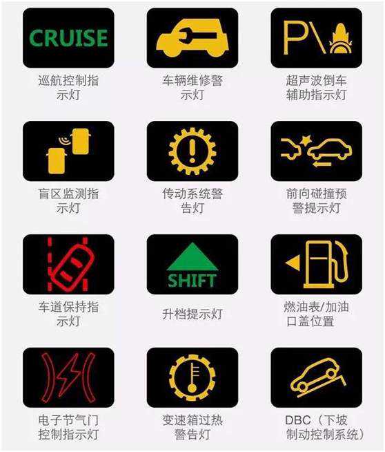 绿色:功能指示灯——起提示作用(如倒车雷达、巡航系统、动力模式开关、换挡提示灯等)