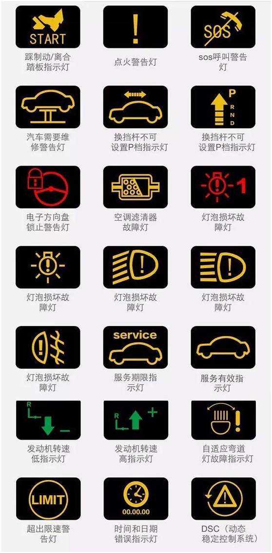 红色:故障警告灯——起严重的警示(如机油灯、安全带指示灯、电瓶指示灯等)