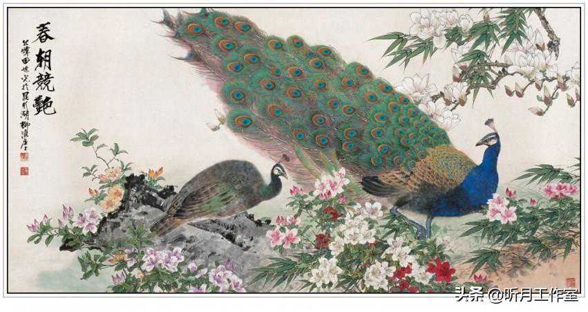 当代著名画家田世光《富贵迎春图》纵125厘米横195厘米。田先生有一批作品画牡丹,孔雀等珍禽异卉都是浩大的场景,如《富贵迎春》《和平之春》《海棠孔雀》《争辉》等作品都是皇家园林气派,繁荣富丽、锦绣辉煌。