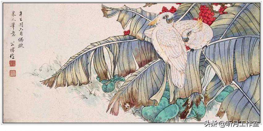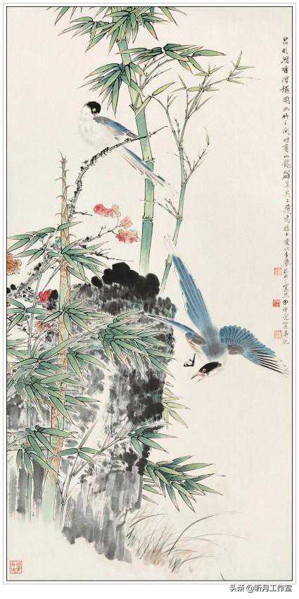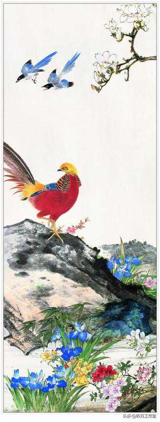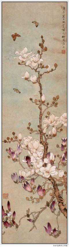 当代著名画家田世光《辛夷双鹦》纵127厘米横70厘米,1954年作。田世光先生的创作风格仍是以双勾重彩为主,以自己为主,对各家各派的技法绝不从表现形式上摹仿,没有生搬硬套,而是灵活地、综合地融会贯通,吸收众家之长,成为一家之体。