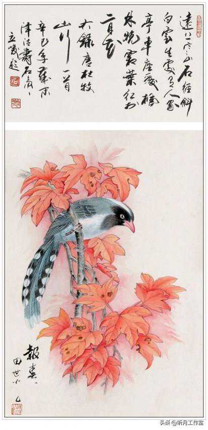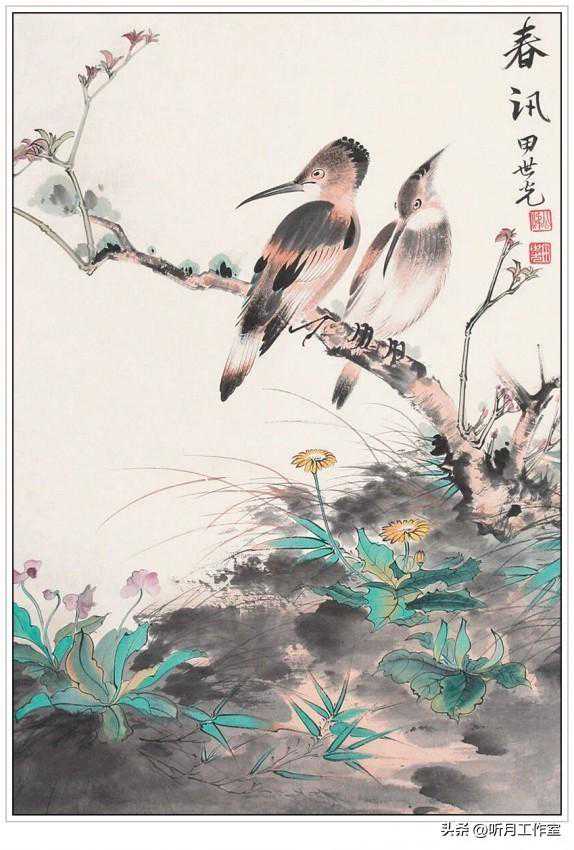 当代著名画家田世光《春岭双棲图》1933年,17岁的田世光在舅舅的资助下,考入了北平私立京华美术学院中国画系,受到了工笔花鸟画教师赵梦朱和山水画教师吴镜汀、书法篆刻教师于非闇暗诸先生的启蒙教导。先生本喜欢山水画,但选学山水画课的大龄学生较多,教师授课时年小的同学都被挤在外边无法近前,因此先生即转学工笔花鸟,兼学山水画。