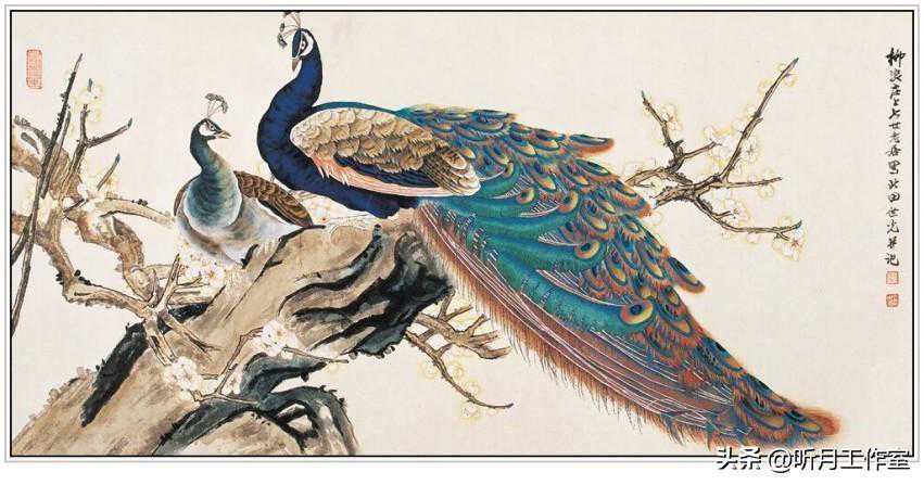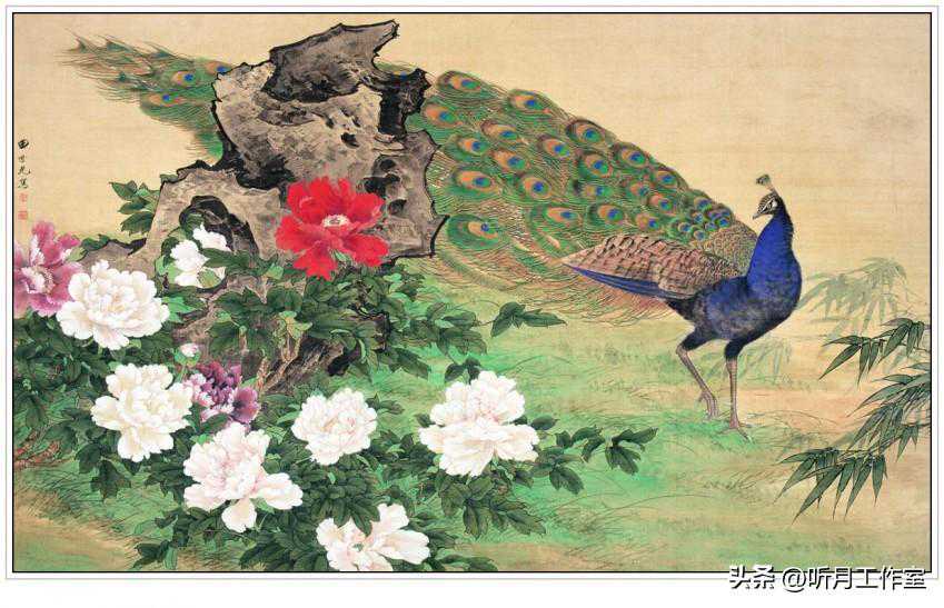当代著名画家田世光《孔雀图》1938年5月,北平中国画学研究会在中山公园“来今雨轩”举办第十五次成绩展览会,展出了田世光用勾勒法绘制的一幅力作《竹枝伯劳》,画面上疏竹兰草簇拥着两大块山石,枯枝上立着一只栩栩如生的伯劳鸟,整个画面清丽工整,情趣盎然。这幅画的创作,得力于田世光对伯劳鸟的写生,还借鉴了宋代崔白的手法。这幅画被选登在当年出版的、代表当时北平绘画创作水平的《艺林月刊》第102期上,中国画学研究会会长周养庵对此画评价颇高,称之曰:“此法三百年来未有矣”。