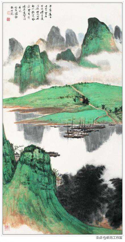 当代著名画家田世光《漓江新颜图》更令人神奇的是先生竟然能以大写意勾皴法创作了多幅颇为精彩的水墨云山,如《漓江烟雨》《漓翠泛舟》《桂林山水》《西陵峡》《太行山色》以及用重淡彩结合法画的山水画作品如《神女峰》《巫峡对岸》《阳朔碧莲峰东望》《巴蜀胜境》等。