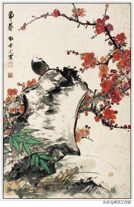 当代著名画家田世光《争春图》1946年6月底,徐悲鸿先生出任国立北平艺专校长,请著名画家齐白石、吴作人、李可染、李苦禅等到校任教。是时,田世光创作了一幅长1.2丈的《幽谷红妆》图,画面以海棠花为主,并以瀑布、山壁、锦鸡作映衬,这是一幅风格独特的花鸟与山水相结合的巨幅作品。先生这幅画颇多含意:当时山水画家总认为花鸟画是雕虫小技;再则人传徐悲鸿大师说北平画界没有巨幅作品。田世光虽然没有见过徐先生,但得闻此言却有些不太服气,他想,画得好坏姑且不论,但是画巨幅画我还是可以的。他有意出品这幅画让徐先生看看。先生这幅巨画参加了在中山堂举办的联展。
