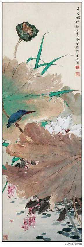 当代著名画家田世光《荷塘双燕图》横33.4厘米纵130厘米。田世光在刻苦学习工笔没骨花鸟的同时尚感不足,那时他常到故宫参观古画,认为古画是重红重绿的,先生就此萌生了光大宋元画派双勾重彩花鸟画技法的宏愿,潜心钻研起来。因为该技法已失传多年,故研究起来非常困难。他认为临摹是承继传统精华的重要手段,就想多看看古代作品。