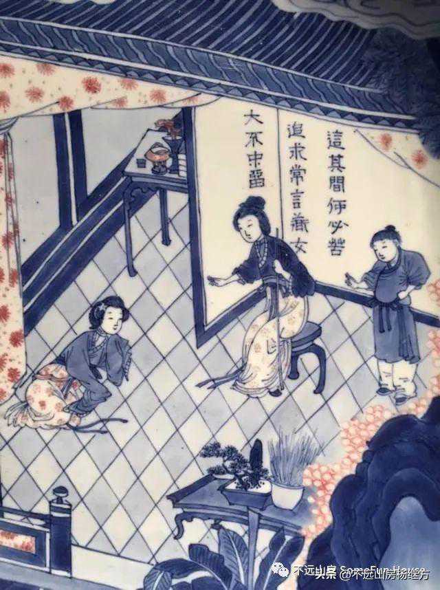 美国觀鹭園主人旧藏的康熙早期青花釉里红西廂记拷红大盘,情节生动,尤其红娘曲词「这其间何必苦追求,常言道女大不中留」起点睛之效。