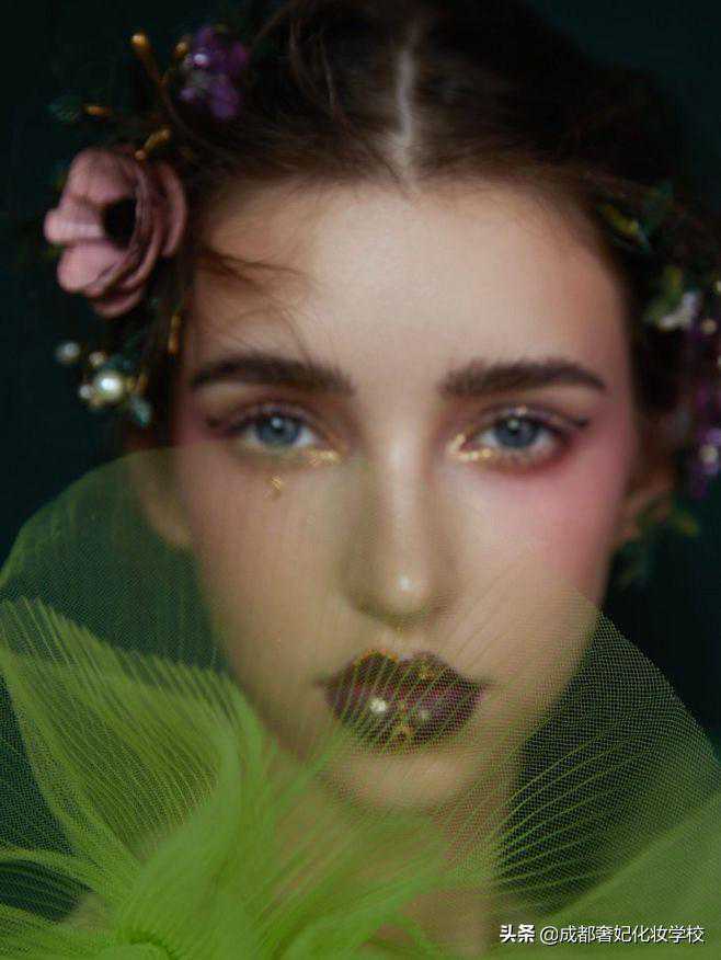 像漫步森林的仙子,翠绿的衣衫,玲珑的薄纱,珍珠饰品,手工花蕊,樱染的双颊中一双小鹿乱撞的灵动眼眸,点缀的一颗小巧珍珠,复古的大红唇上的一点金色雕饰,这从旧时光中漫步而来的森林精灵啊,优雅而神秘