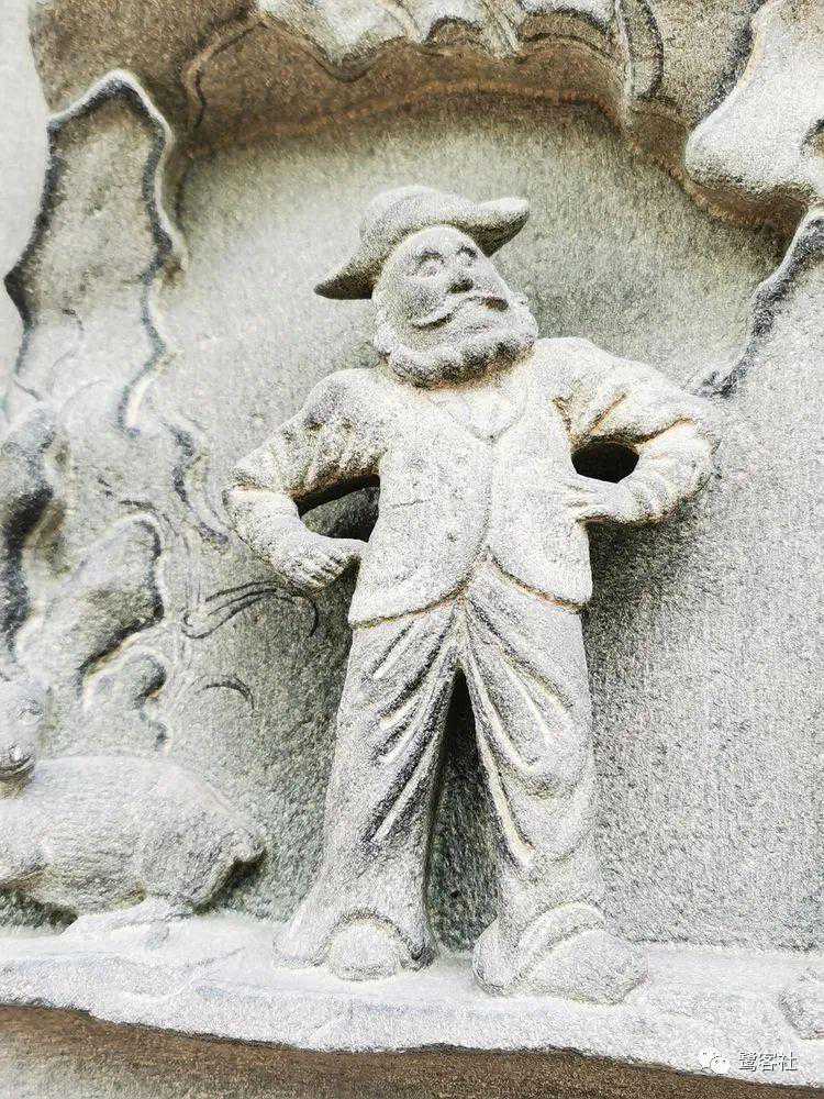 胡人纹饰也有不骑兽与献宝的。早在2010年,厦门一报社便曾报道了同安旧影剧院旁的“王纯开妻陈氏”节孝石牌坊上有一个洋人形象。报道中称此“洋人石”在厦门传统的节孝石牌坊上还是首次出现。“王纯开妻陈氏”节孝石牌坊建于1807年(清代)。2017年的一篇漳州新闻也同样报道了类似的事,如建于1707年(清代)位于新华东路岳口街道的“勇壮简易”石牌坊,同样发现类似的“洋人石雕”(至少有两件)。2021年4月23日,我在漳州市龙海区石码镇始建于光绪年间的杨氏大夫第墙壁上,亦发现了民居墙壁上的“洋人石雕”。之后,我在厦门岛内的林云梯故居与卢厝同样发现类似的“洋人石雕”。三座古厝的“洋人石雕”极为相似:从左到右依序为叉腰的洋人、背婴曳娃身着草裙的番婆、持杖老者。个中有着约定俗成的相似的民俗寓意。经过认真的思索,我研判此三者其实就是归侨版的“福禄寿”,一种流传在归侨内部的中西合璧版的新型“福禄寿”。洋人为“福”;持杖老者为“寿”;背婴曳娃身着草裙的番婆为”禄“。