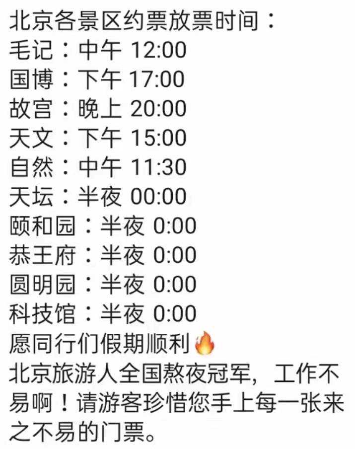 中国旅游报消息称:北京进入到旅游旺季,目前多数场馆都需要预约,旅行社为了能’抢'到票,动员了包括导游在内全员通宵达旦参与抢票。旅游旺季,导游几乎是24小时待命,超负荷工作,晚上12点还在拼命抢票,凌晨2点钟就要起床准备带游客去看升旗。