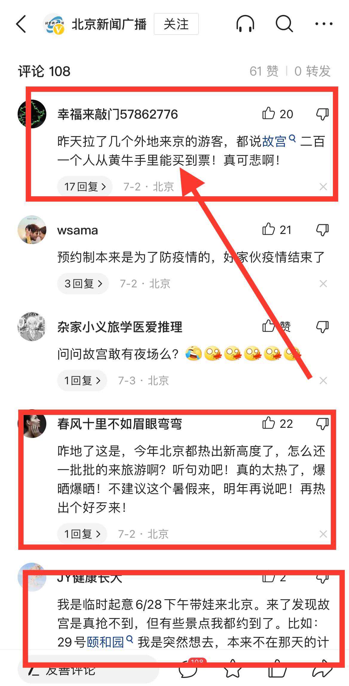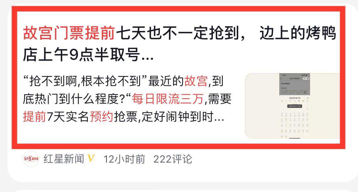 从暑假以来,北京旅游业基本恢复到2019年状态,故宫每日限量3万名游客,致使很多外省游客在没有预约到故宫门票之前,就不敢启程去北京旅游,很多游客车票买了之后,到了北京故宫一票难求,只能从黄牛手中购买高价门票,有游客反映黄牛门票已经翻过原本门票价格6倍。面对暑假旅游高峰,故宫一票难求,希望官方能够管控好黄牛票,让千里迢迢的外省亲子游都能买到平价的故宫门票。