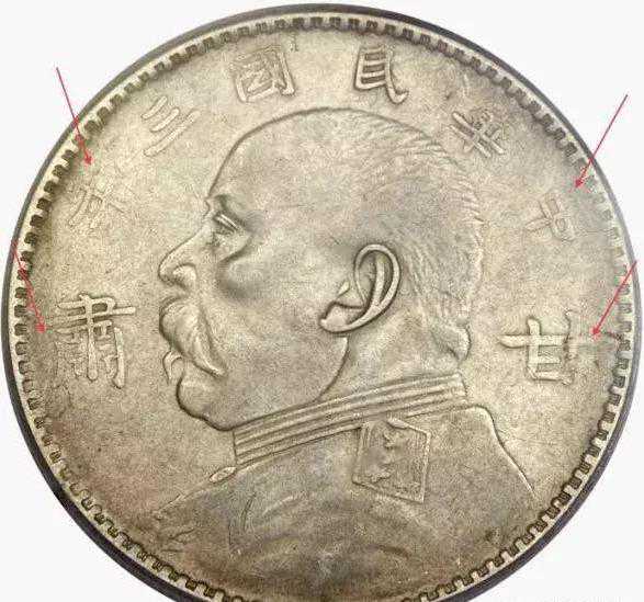 此版特征是,袁像两侧铸有甘肃二字,“中”“年”“甘”“肃”字弱打,据说是当时的模具原因造成的;“圆”字内有一个圆点暗记,袁像胸襟前有长城暗记;“壹”字起笔和“豆”字的起笔和收笔很圆润。