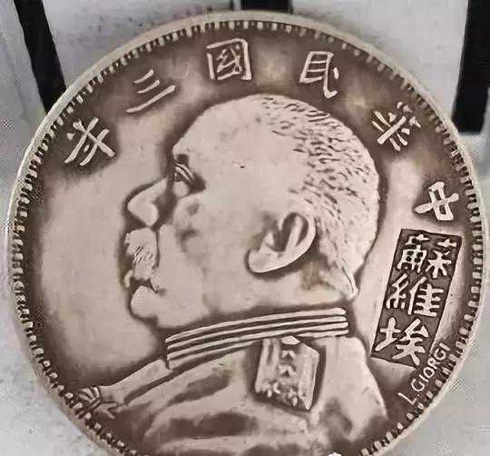 在1931年,国民党反动派对苏区进行军事围剿和经济封锁,红色政权对敌斗争环境十分恶劣,为了适应对敌斗争形势的需要,共产党人就在打土豪收缴上来的民国三年袁大头旧银元上,在袁像右侧打上了‘苏维埃’的戳记,为我所用,以示区别,用来保障红军供给和红色政权建设。后国民党曾大量收缴苏维埃版银元回炉重铸,因此存世量较少,市场价格100万元以上。