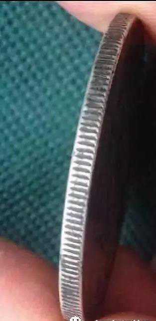 四是边齿。真品边齿大小一致、深浅一致,传世磨损痕迹自然;伪品边齿不规整、深浅不一,甚至歪歪扭扭。下面是真假袁大头边齿对比。