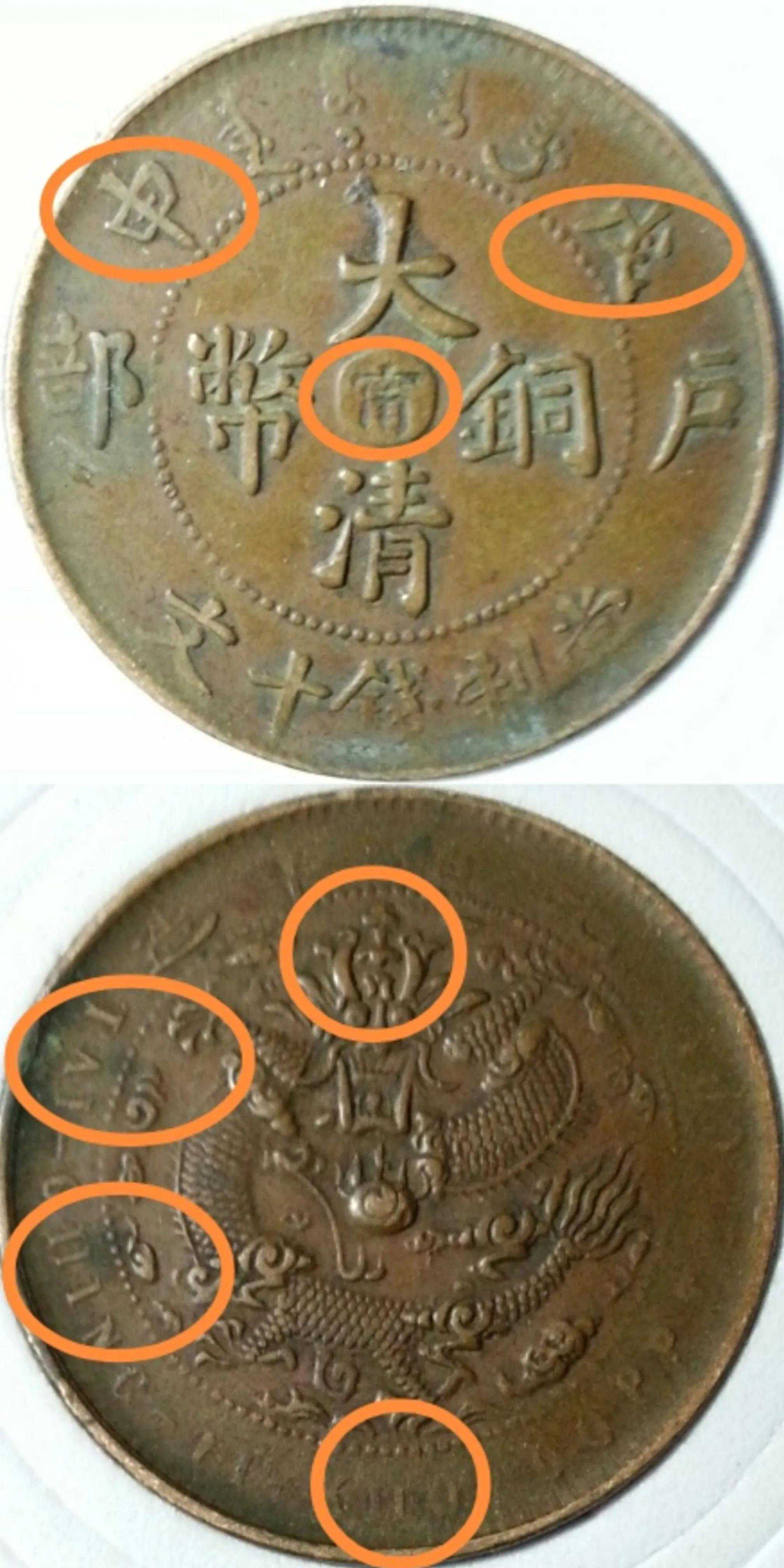 光绪三十四年(公元1908年),岁在戊申。江南铜元局制造戊申纪年大清铜币,字面只有一个大版,极其细微区别,暂不作为版别区分。龙面可分为五火焰大眼龙、低冠短六尾和低冠长六尾以及高冠错英文。其中大眼龙五火焰属于错配是戊申宁中最少的一款,其次为高冠弯角龙四处错英文两个版。低冠龙长、短六尾龙和高冠弯角龙四处错英文为正配,较多。
