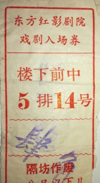 这张票印章上的字是,"民主路、和平、夜",表明是民主路和平戏院夜场。