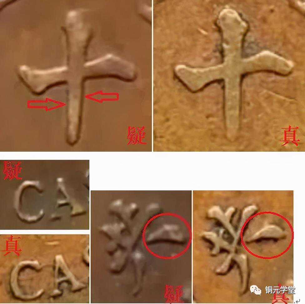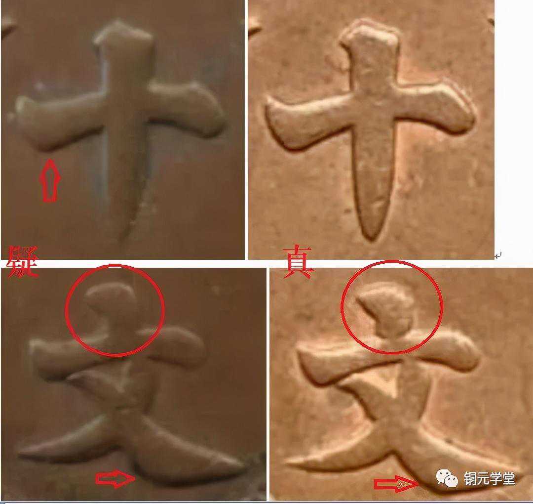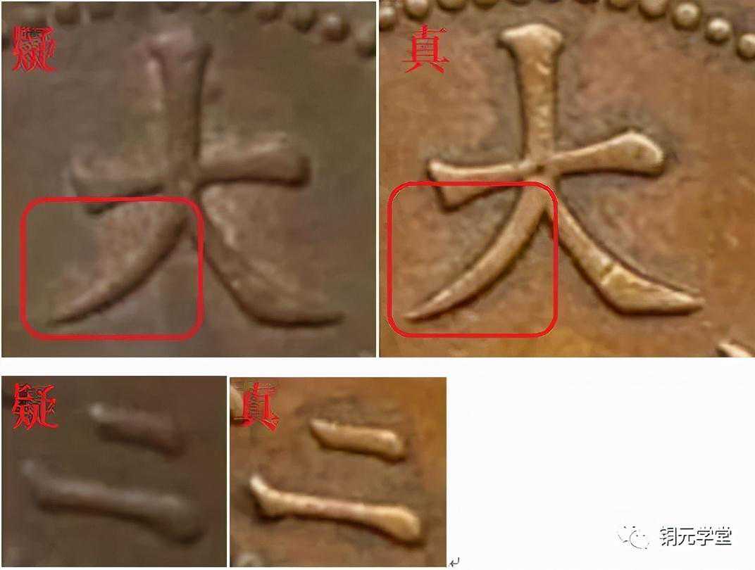 “大”字一捺的走势有问题,“幣”字反文以点代捺的点也有问题,两枚的点长度不一样,写法也不一样。