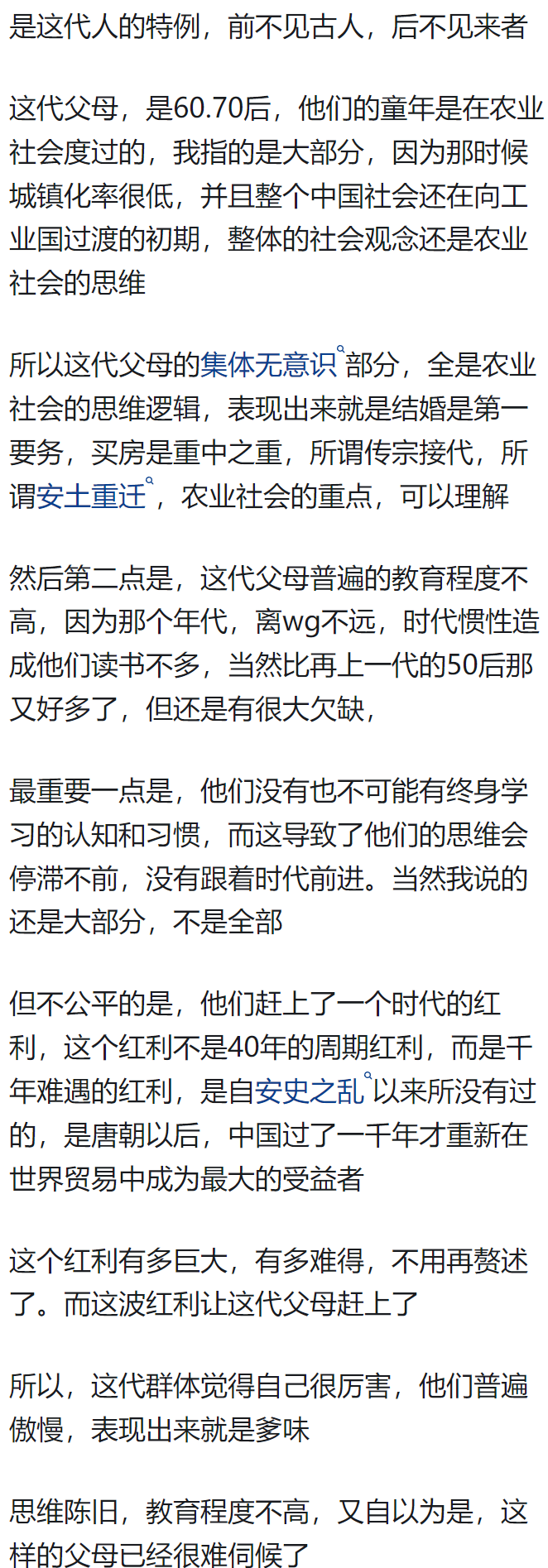 因为那些没有做到的人他们是没有做到,但他们认识的很多人都做到了所以他们觉得他们的思维就是正确的因为他们见识到那代人人是怎么做起来的感觉80后最有意思,既能理解60,70的辛苦和傲慢,又能理解90,00的独立和自由。但自己到底是啥?不知道。。。狠绝的话说尽,狠绝的事儿做尽,那个年代不愚蠢,不自私,不无知根本就活不下去。我爸爸地地道道农村人,跟我说小时候读书,家里大人都不同意,总挨骂,说谁谁谁又割了多少草,锄了多少地,就他要读书,什么事都做不了。都看到这儿了