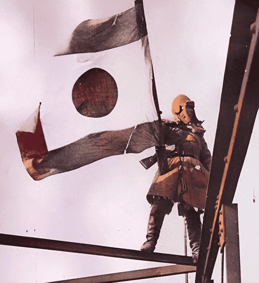 这个日本鬼子,抱着我国的小孩儿,还让不懂事的小孩,举着他们的国旗。