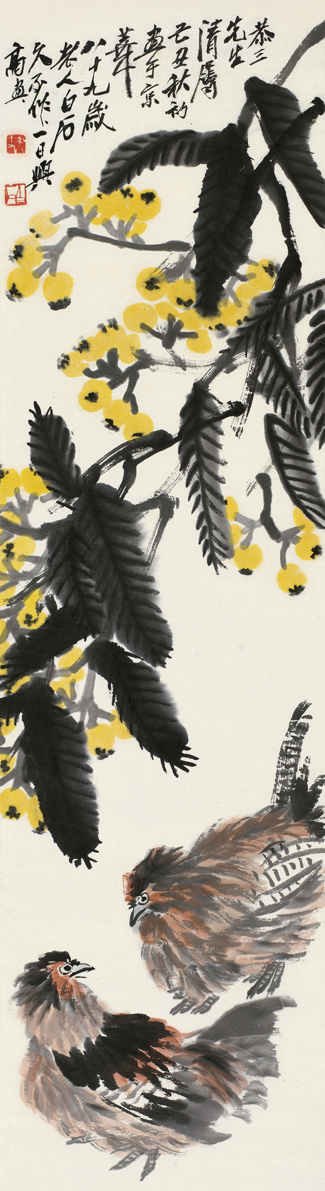2.齐白石作品往往贴近百姓生活,常把民间吉祥图案的寓意带入画中,此中枇杷金黄色的果实呈球形,可以滚来滚去,因为具有财源滚滚的寓意,又名黄金果。鸡在中国传统里有“吉”的寓意,故而深受人们的喜爱。