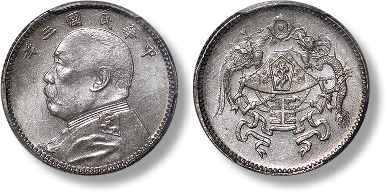 造币厂内部将民国三年袁世凯像壹角银币之正面与十五年龙凤壹角银币之反面合铸而成,打制极为精美,因精心打制,所以版模深峻,图像细节呈现极为精美,镜面精铸,呈现样币风范,原色原光,品相一流,目前所见仅此一枚,另有金质与铜质,极为珍稀难得,值得珍视与推重,为金盾此品种唯一入盒者。