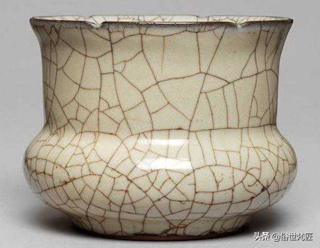 “金丝铁线”型开片:《简明陶瓷辞典》解释为“纹片的一种,哥窑才起的特殊纹饰,因开片釉大,小的区别,大开片呈现深灰色,小开片为黄褐色,似金线而得名。”这种仅要将开片的特征表述出来的开片属于匠人二次开片。