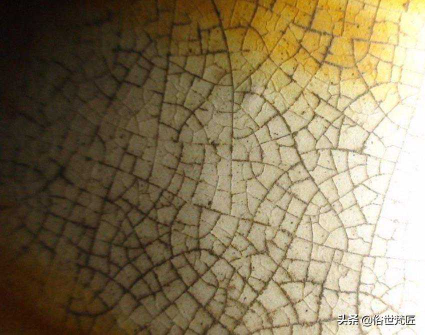 “芝麻纹”开片:这类开片形态与唐三彩釉面开片类似,细如芝麻颗粒,但因贴附在釉面表面上,附着力相对较强,釉面无翘起线下。