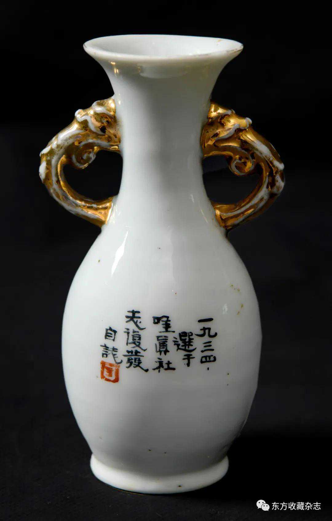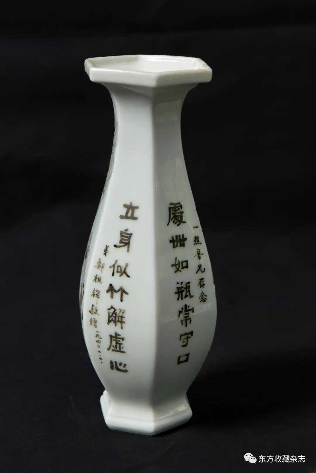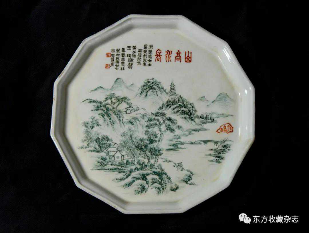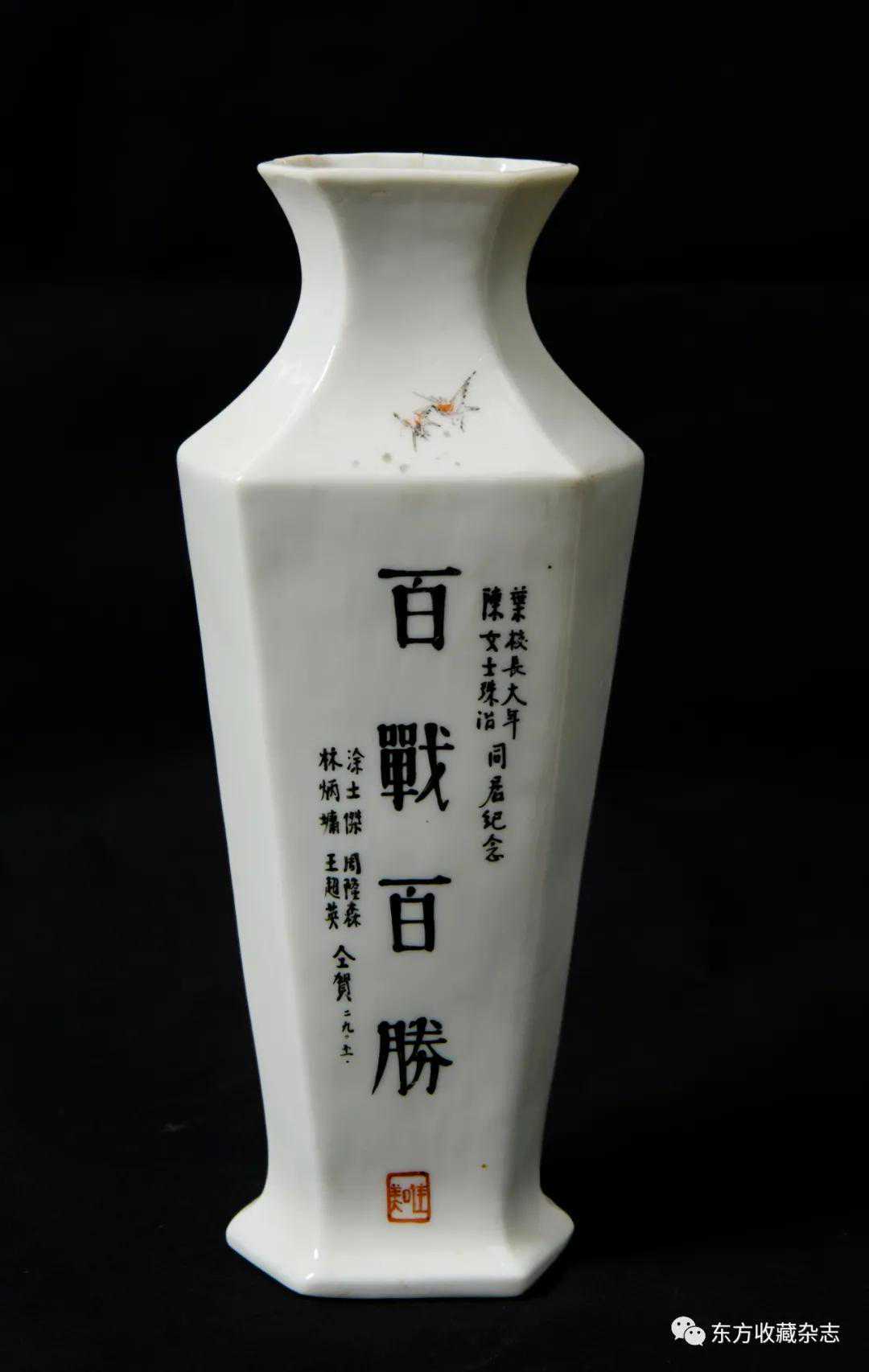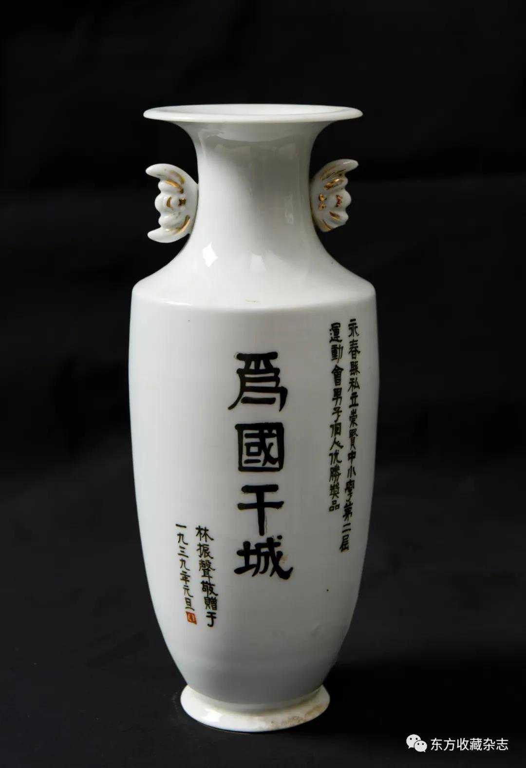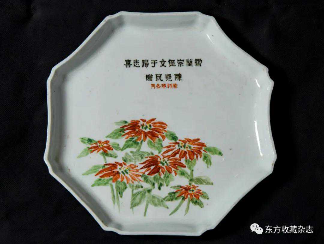 此外,在四大瓷社传世的各类作品上我们还发现大量专门定烧的铭款,说明当时除生产各类大宗产品外,他们还接受有关个人、名人、堂号主人乃至祠堂、宗祠等的私家定烧,如时任永春县图书馆馆长、弘一法师在永春期间的执事弟子王锦机、永春崇贤中学原校长叶大年等均见有定制品传世,多用于婚庆、祝寿、活动纪念、私人交往等馈赠用途,这些也充分说明了它们在当时的影响性。与此同时,这一时期四大瓷社生产的作品,多喜题字、题诗,也由此涌现了一批瓷绘名家,如江西·福建分卷收录的釉上五彩丹凤朝阳图筒瓶,器身描绘一轮红日下凤鸟飞舞的场景,其左上角题“丹凤朝阳,民国二十六年(1937)春画于桃源三美瓷学社”。另外一侧临石鼓文开篇“吾车既工,吾马既同。吾车既好,吾马既阜。君子员猎,员猎员游。麀鹿速速,君子之求。骍骍角弓,弓兹以寺。吾驱其特”,无论绘画或是书法都十分精彩。而这些,都出自当时永春窑著名的书法、瓷画名家陈尧民之手,他创作经验丰富,造诣深厚,作品文人气十足。第八批全国重点文物保护单位永春岵山福兴堂里边留有其大量的珍贵墨迹。从其传世陶瓷制品来看,画面内容清晰洒雅,光泽莹润,别具韵致,并且将中国文人画诗、书、画、印于一体的审美艺术形式、审美旨趣、艺术表现形式应用到陶瓷绘画、书法创作之中,给当时的陶瓷艺术带来了新的活力,实乃当时永春窑陶瓷装饰艺术的一大特色,较之同一时期德化窑乃至景德镇窑的瓷绘艺术,都毫不逊色。