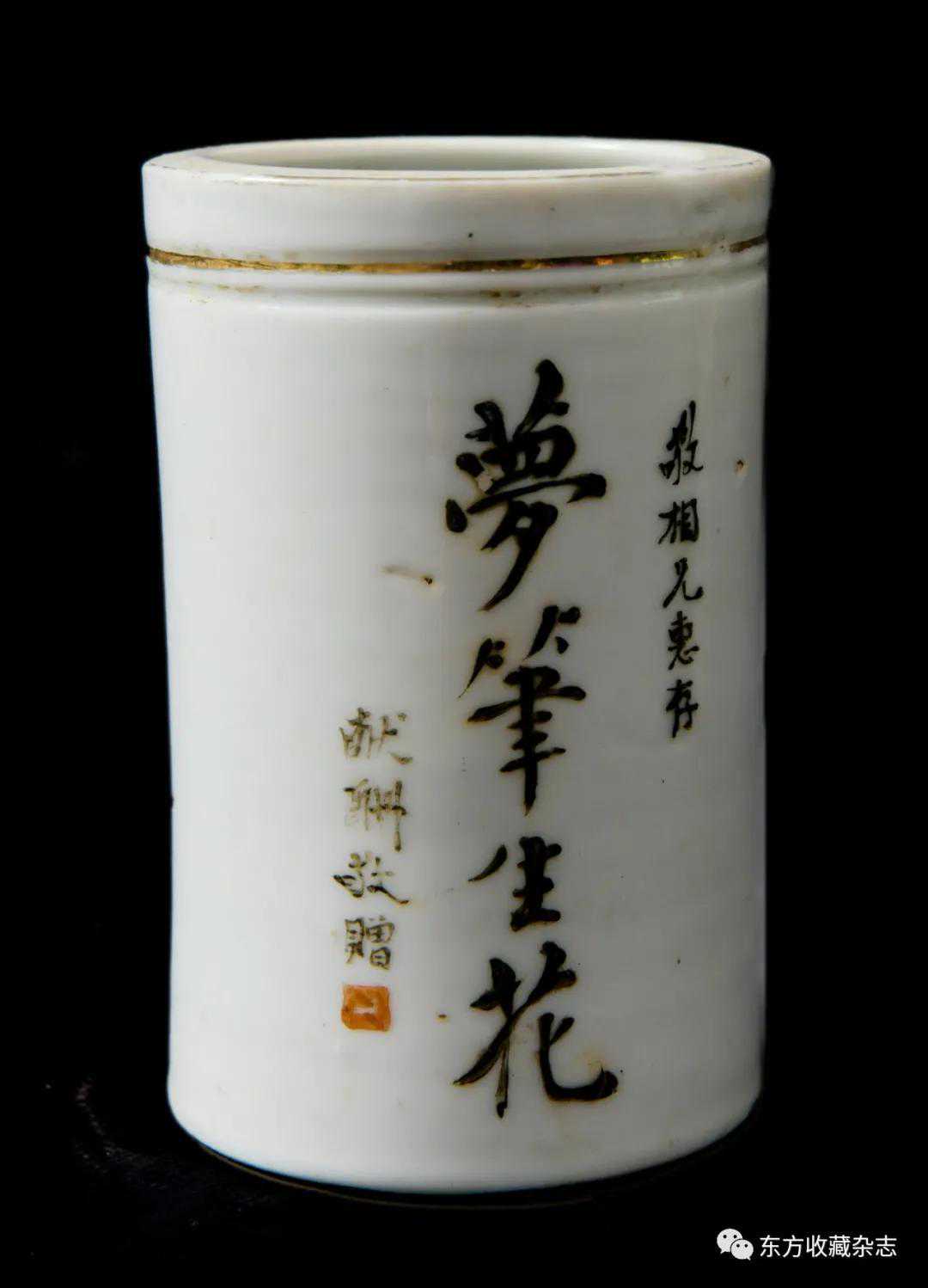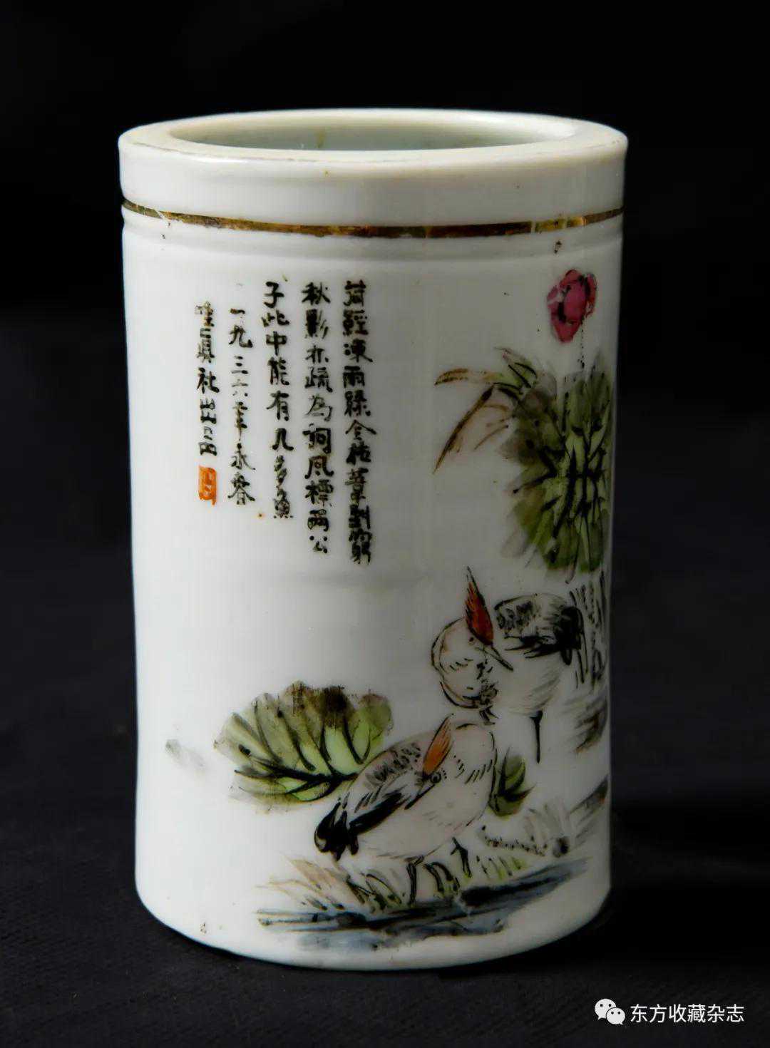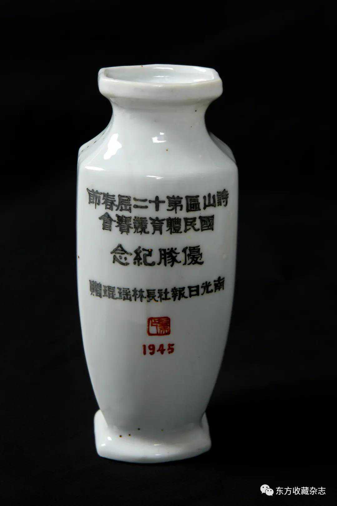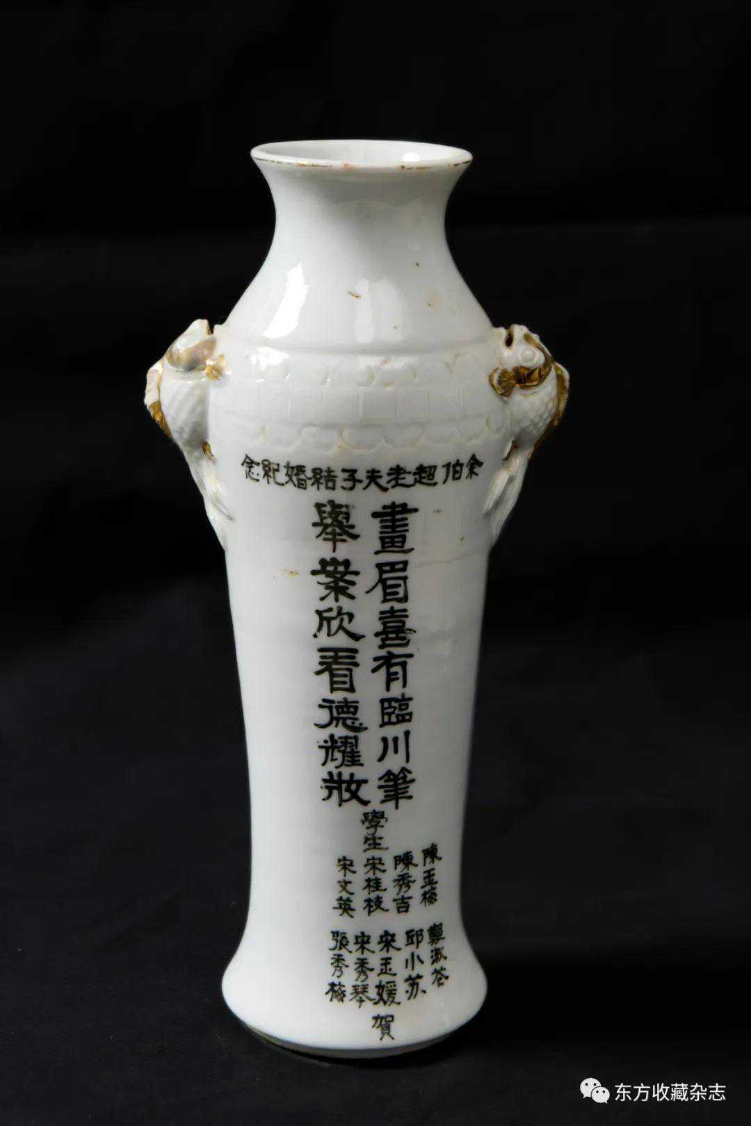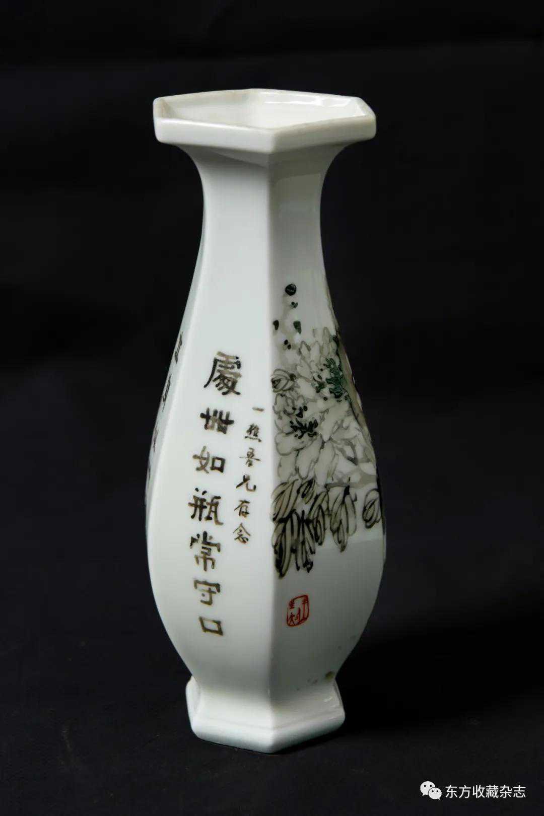 此外,在四大瓷社传世的各类作品上我们还发现大量专门定烧的铭款,说明当时除生产各类大宗产品外,他们还接受有关个人、名人、堂号主人乃至祠堂、宗祠等的私家定烧,如时任永春县图书馆馆长、弘一法师在永春期间的执事弟子王锦机、永春崇贤中学原校长叶大年等均见有定制品传世,多用于婚庆、祝寿、活动纪念、私人交往等馈赠用途,这些也充分说明了它们在当时的影响性。与此同时,这一时期四大瓷社生产的作品,多喜题字、题诗,也由此涌现了一批瓷绘名家,如江西·福建分卷收录的釉上五彩丹凤朝阳图筒瓶,器身描绘一轮红日下凤鸟飞舞的场景,其左上角题“丹凤朝阳,民国二十六年(1937)春画于桃源三美瓷学社”。另外一侧临石鼓文开篇“吾车既工,吾马既同。吾车既好,吾马既阜。君子员猎,员猎员游。麀鹿速速,君子之求。骍骍角弓,弓兹以寺。吾驱其特”,无论绘画或是书法都十分精彩。而这些,都出自当时永春窑著名的书法、瓷画名家陈尧民之手,他创作经验丰富,造诣深厚,作品文人气十足。第八批全国重点文物保护单位永春岵山福兴堂里边留有其大量的珍贵墨迹。从其传世陶瓷制品来看,画面内容清晰洒雅,光泽莹润,别具韵致,并且将中国文人画诗、书、画、印于一体的审美艺术形式、审美旨趣、艺术表现形式应用到陶瓷绘画、书法创作之中,给当时的陶瓷艺术带来了新的活力,实乃当时永春窑陶瓷装饰艺术的一大特色,较之同一时期德化窑乃至景德镇窑的瓷绘艺术,都毫不逊色。