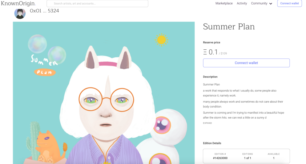 MakersPlace对于创作者而言,MakersPlace也是个低门槛平台,只需提供一张证件照,MakersPlace就可为其生成的ERC-20代币,用于作品交易。不过,虽然MakersPlace是免费使用,但所有交易费用需由创作者或收藏者自己买单。