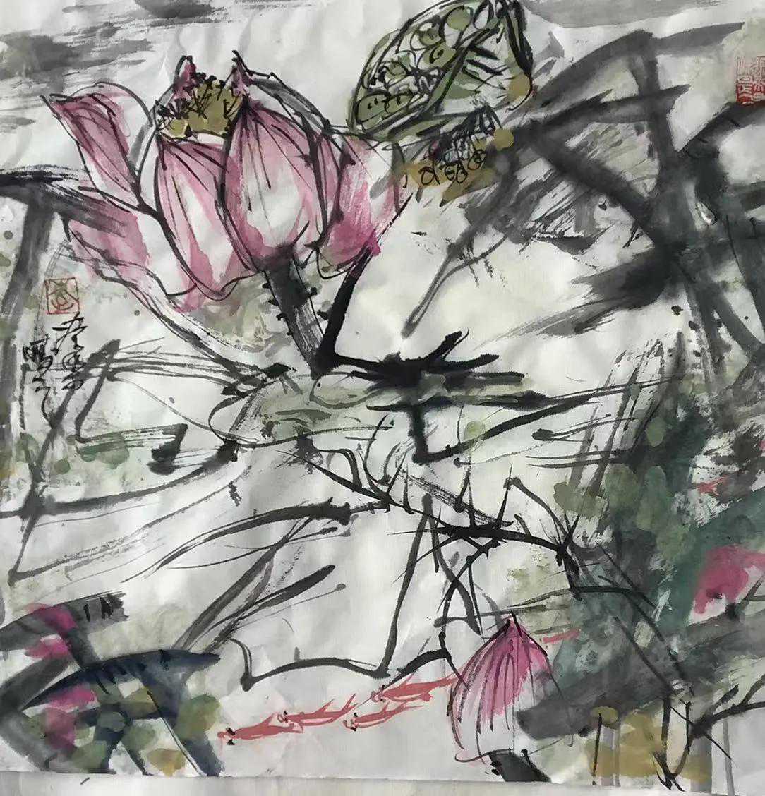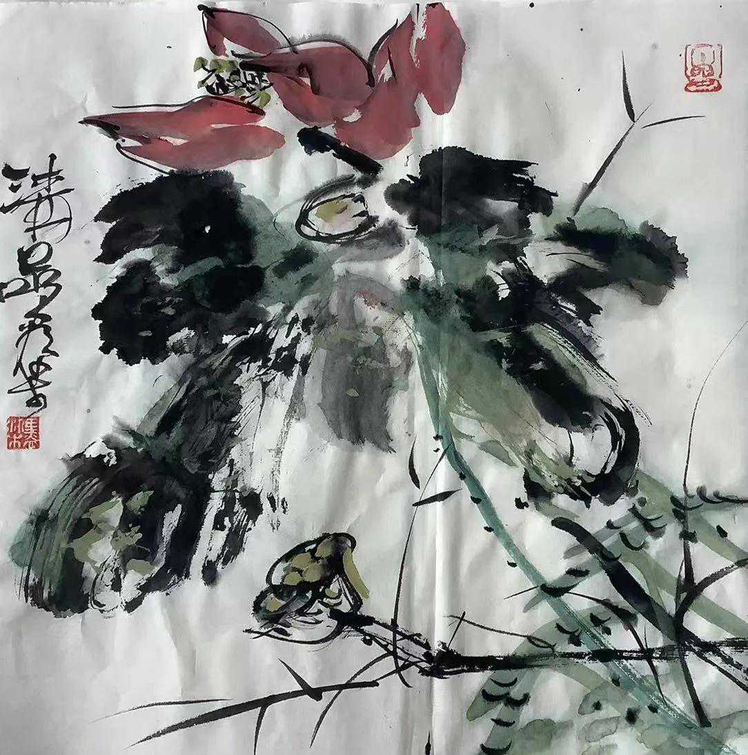 荷花是历朝历代,大家名流笔下的尤物。从周敦颐的爱莲说,予独爱莲之,出淤泥而不染,濯青莲而不妖,中通外直,不蔓不枝,香远益清,亭亭净植。到苏东坡,欲把西湖比西子,淡妆浓抹总相宜。到朱自清的荷塘月色。一朵朵千娇百媚长袖善舞的荷花,藕入池中玉管通地理,荷出水面朱笔点天文。天使般的荷花,成了历朝历代一个个名人笔下深深的眷恋……张大千画荷,迎风摇曳,如贵妃醉酒。潘天寿写荷,如婷婷少女玉树临风顾盼生情,齐白石之荷,如青女降雪,一派朴素无华。尽染之荷,艳而不妖,甜而不俗,百花千面每一幅荷花都透出的灵气,才气,洒脱之气。从他笔下线性的灵动天成,泼墨狂扫风雨快,笔所未到气已吞。高古优游,玉振金声,到他游走于传统的精妙古朴,自然与现代构成的线性美、构成美、色彩美的解构,构建了他的荷花,新奇大气天籁袅袅,澡雪精神,芙蓉如水,秋神如面,似花解语,如玉生香……