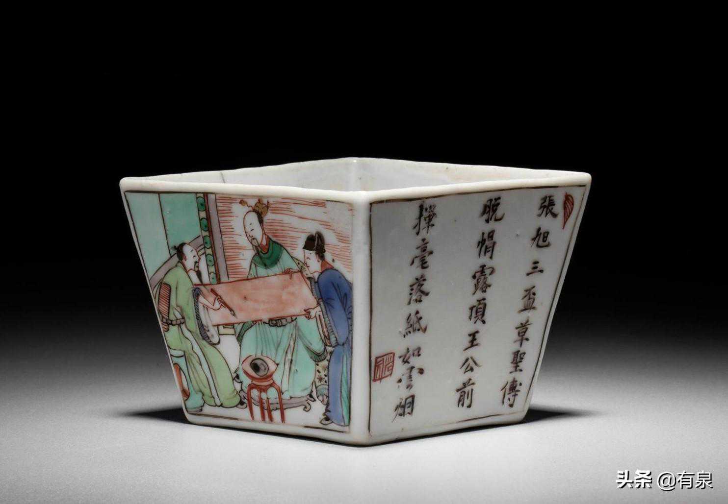 斗方杯始于明,像古代量米用的斗,梯形的,故名斗方。过去没有石膏模具,这种杯又不能拉坯成型,要用泥片拼接粘合起来,制作难度很大,烧制过程中的变形率也很高,珍贵。斗方杯多用做酒杯,一些有侧把,明代的斗方杯内部有加固泥条,用于防止烧窑时变形,清代技术进步,省了泥条。还有一种梯形的紫砂壶也叫斗方,不过是倒过来的。