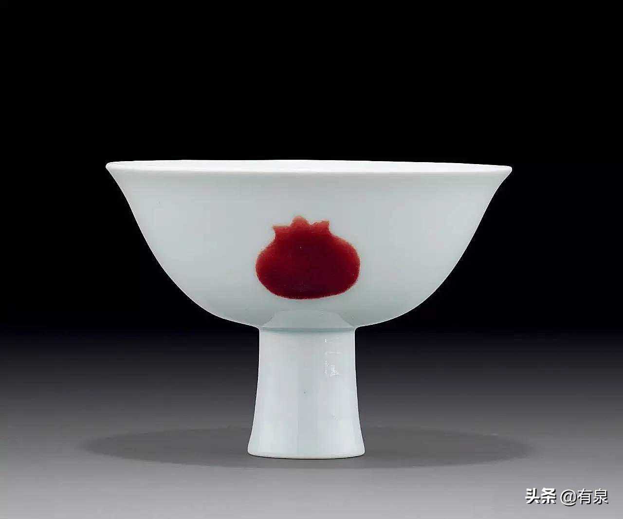 明清时高足杯多用于祭祀,在寺庙里叫净水杯,还有一种高足盘也是礼器。明代有种高足杯最珍贵,先施甜白釉,然后剔出画面,以祭红釉填之,多画三鱼或三果,有红宝石般的迷人光泽,后人误以为是用宝石做釉,故名宝烧。现在的仿品多省略了剔釉环节,色泽暗淡,东施效颦。