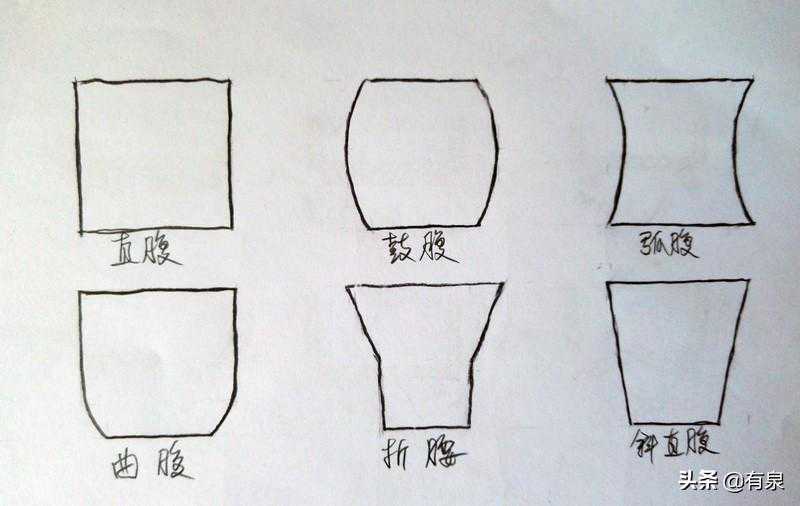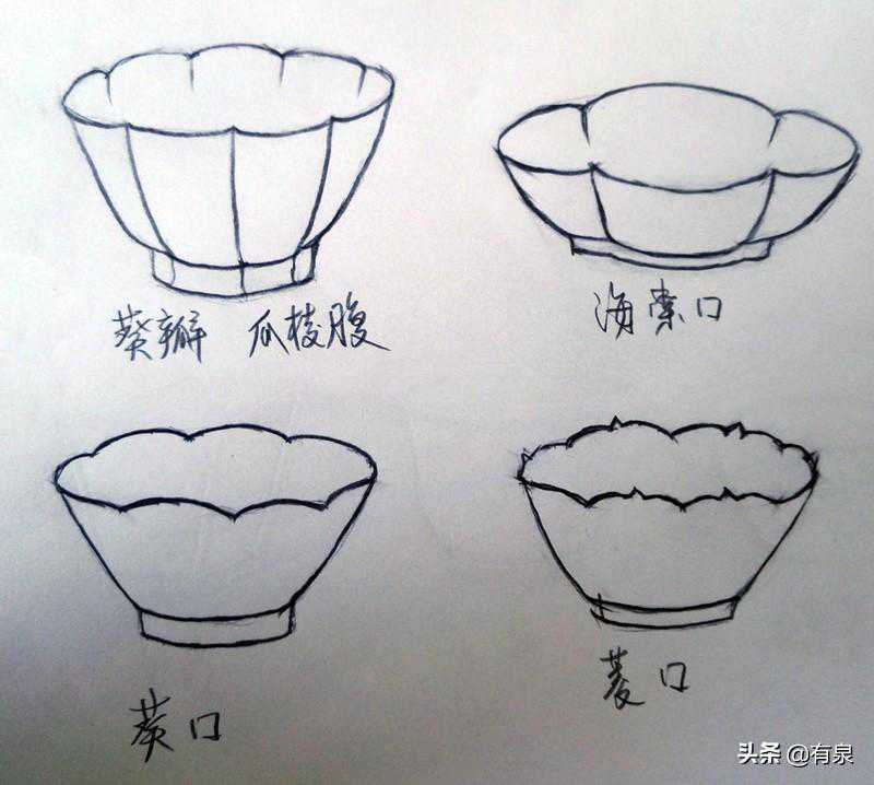 这三张图片解释刚才提到的器形术语。如果你见到个不认识的茶杯,只要说出其器形特征,内行人大概就能猜出你指的是什么。其中瓜棱腹的杯盏一般是越窑和龙泉窑的作品,要印坯成形。海棠口必须是椭圆四瓣,宋以后多用做花盆。葵口是秋葵花的形状,菱口是葵口上加个尖,两者统称为花口,可以印坯,也可以拉坯后雕刻成形。