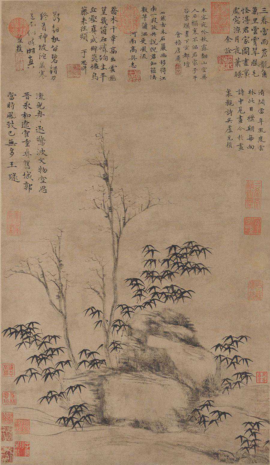 此图以淡墨侧锋皴出坡上乔柯拳石,浓墨写细竹三五茎,苍古之中饶有秀润之气。倪瓒的作品,被时人称为“殊无市朝尘埃气”。画面总是平远小景,疏疏落落,悄无人影,枝头无绿叶,仅有萧疏瘦硬的干枝,具清冷、寂寞、淡然之意。与其说他表现的是景色,莫如说是心情的写照。