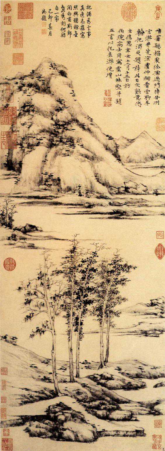 树木用笔简洁疏放,似不经意而骨力内含。故王铎题语中评道:“画之简者,其神骨韵气则不薄。”画幅中自题一则,述作画经过。此图作于至正五年(公元1345年),时倪瓒年四十五岁。画幅中还有元公望、朽木居士、赵觐、钱云等诗。诗塘中有明人董其昌题识,裱边有明人王铎,清人周寿昌、许乃普、陈荣等题跋或观款。
